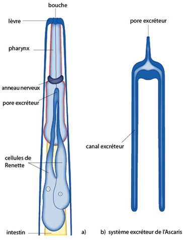 Le système excréteur des Nématodes est très particulier, il est d'origine ectodermique et est un caractère dérivé propre des Nématodes. Chacun des deux canaux latéraux est creusé dans une seule longue cellule épidermique, qui fait presque toute la longueur de l'animal et est appelé cellule Renette. Il y a un noyau cellulaire par canal. Chez l’Ascaris, les deux longs canaux latéraux se rejoignent au niveau du pore excréteur.