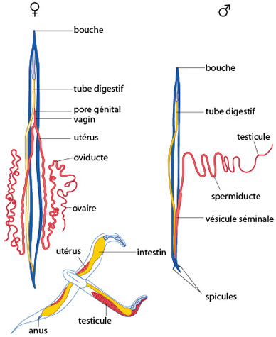 Sur la figure sur la gauche on voit également la position de copulation de deux nématodes. Lors de la copulation, les spicules du mâle sont introduits dans le vagin de la femelle et les spermatozoïdes sont évacués par le cloaque dans le pore génital de la femelle. Ovocytes et spermatozoïdes se rencontrent dans l’utérus. Les œufs fécondés descendent et sont entourés au passage par une coque sécrétée par les glandes de la paroi interne de l'utérus. Enfin, les œufs sont pondus dans le milieu extérieur, en l'occurrence, l'intestin du Cochon pour Ascaris suum.