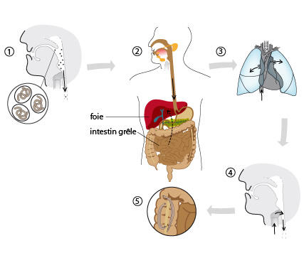 4. Du poumon, la larve remonte la trachée, vire dans l'oesophage, et se laisse porter par le circuit digestif, jusque dans l'intestin.
