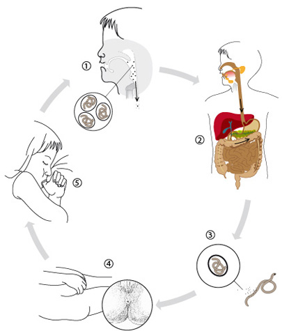 5. Il se peut que des humains, surtout les enfants qui manquent d'hygiène, se grattent l'anus et mettent en bouche leurs doigts souillés. Ils avalent alors un embryon d'Enterobius et le cycle recommence. Rarement, l’œuf peut également éclore au niveau de l’anus et infecter l’homme via l’anus.