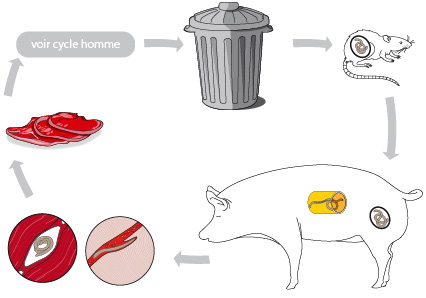 Supposons que notre homme a jeté à la poubelle les restes de son repas de viande mal cuite, qui sont goulûment récupérés par un rat. Dans ces restes, il y avait encore quelques embryons de Trichine. Les kystes éclatent dans l'estomac du Rat, les embryons gagnent son intestin, y atteignent l'âge adulte, les femelles mettent bas leurs embryons, qui s'enkystent dans les muscles du Rat. Et quand à son tour, le Rat se fait manger par un Cochon, le cycle recommence chez ce dernier. Donc, pour chaque hôte mammifère potentiel, nous retenons : la Trichine adulte dans l'intestin, et les embryons enkystés dans les muscles, avec propagation d'un hôte à l'autre en mangeant le muscle parasité.