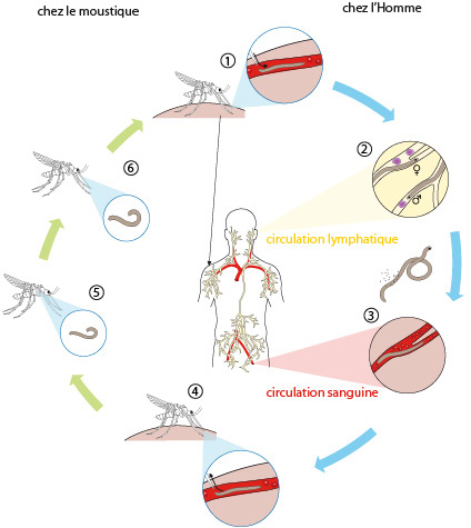 4. Les microfilaires peuvent se retrouver dans le système sanguin de l’homme et quand un moustique prend un repas de sang, il ingère ces microfilaires.