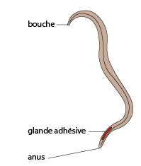 Les Nématodes qui vivent dans les torrents rapides ou des cascades de montagne peuvent se fixer sur un support grâce à la sécrétion visqueuse de glandes, à l'extrémité postérieure. Presque tous les Nématodes libres possèdent ces glandes, plus ou moins développées, mais les espèces parasites en sont dépourvues.