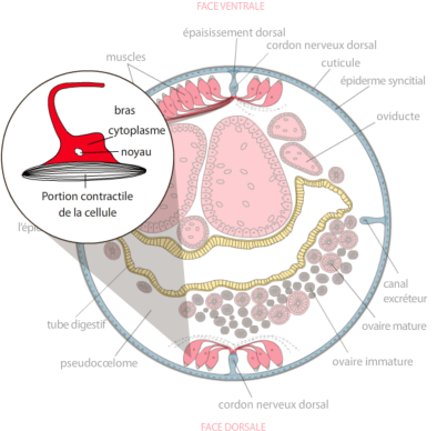 Nous allons commencer par le tégument. Le schéma représente une coupe transversale d'une femelle d’Ascaris. La cuticule, représentée par le trait noir épaissi qui limite le dessin, est épaisse et élastique. Elle tapisse tout le corps de l'animal. La cuticule protège l'Ascaris mais surtout, elle contribue à son squelette hydrostatique, comme nous le verrons bientôt. La substance complexe qui constitue la cuticule est sécrétée par un épiderme syncytium. Le syncytium est une couche continue de cytoplasme, contenant de nombreux noyaux ; au cours du développement embryonnaire, les cellules épidermiques ont fusionné pour former ce syncytium. Vous constatez que l’épiderme syncytial a quatre épaississements: un dorsal, un ventral, et deux latéraux. Vous retrouvez sur la coupe transversale les deux cordons nerveux, ventral et dorsal au niveau de ces épaississements. Vous voyez aussi les canaux excréteurs logés dans les épaississements latéraux.