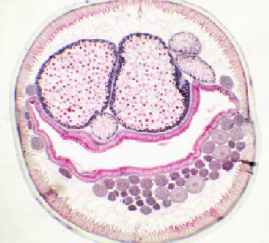 Sur la coupe transversale, on voit la section du système digestif, très aplati, d’origine endodermique. Vous verrez au microscope ou en cliquant sur la paroi que sa paroi est formée d'une seule couche de cellules cylindriques absorbantes, avec des microvillosités très serrées sur la face apicale. Le tube digestif est dépourvu de cellules glandulaires. Comme l'Ascaris vit en parasite, il suce de son hôte une nourriture déjà décomposée.