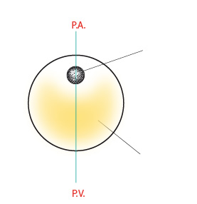 On distingue 2 pôles à cet œuf : le pôle animal (P.A.) et le pôle végétatif (P.V.). Le pôle animal renferme le noyau tandis que le pôle végétatif est plus chargé de vitellus. L'axe passant par les pôles est tracé en vert. Ceci vous rappelle certainement l'oeuf de la Grenouille !