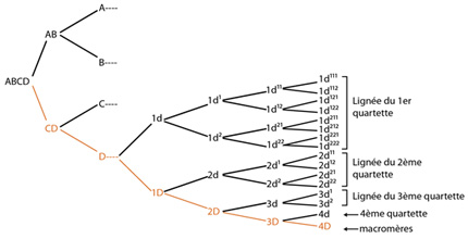 Après la troisième segmentation (stade 8), quatre micromères s'isolent au pôle animal et sont intercalés entre les quatre macromères du pôle végétatif. Les 4 micromères constituent ce que les embryologistes appellent le premier quartette. Les micromères du premier quartette du pôle animal seront appelées 1a, 1b, 1c, 1d. La lettre a minuscule désigne un micromère issu du macromère A majuscule, et rend compte ainsi de son origine. Le coefficient 1 indique le rang: c'est d’ailleurs le PREMIER quartette. Les 4 macromères prennent la désignation 1A, 1B, 1C, 1D (A, B, C, D, en majuscules).