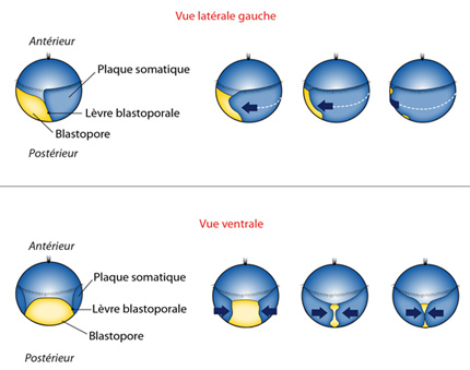 En-dessous de l'équateur, la zone ectodermique confinée à la partie dorsale de l'embryon, en bleu foncé, s'appelle « plaque somatique ». Ses bords forment les lèvres du blastopore. Les cellules de la plaque somatique se multiplient et donc la plaque s'étale. Ses lèvres se rapprochent. Vous le voyez durant l'animation :