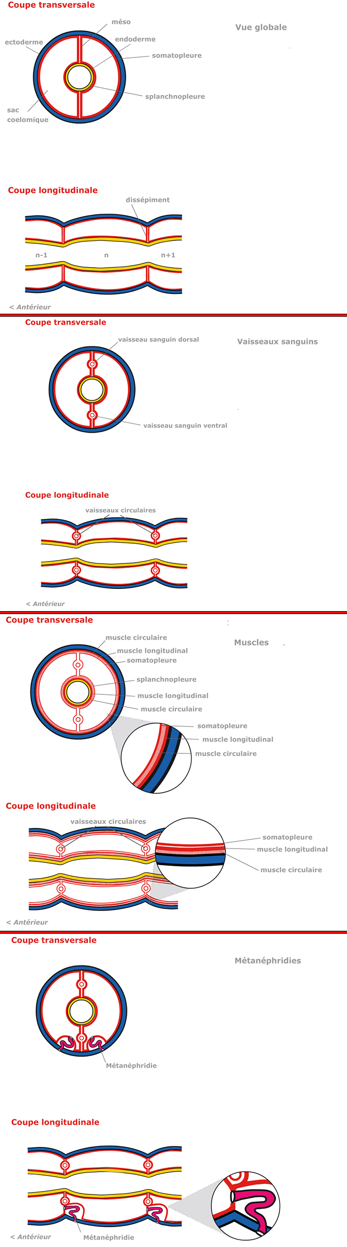 Dans le cas des mésos, sur la coupe transversale, des espaces tubulaires longitudinaux sont préservés : ils donneront naissance aux vaisseaux sanguins dorsal et ventral, qui du fait même de leur formation, seront continus d'un métamère à l'autre.