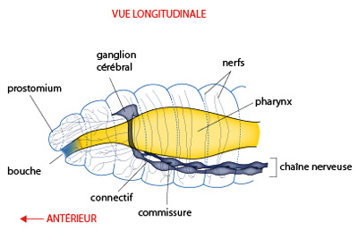 Vers l'avant, les connectifs se prolongent jusqu'à rejoindre le système nerveux situé au sommet puisque la chaîne nerveuse ventrale est sous l'intestin, un collier entoure la partie antérieure du tube digestif.